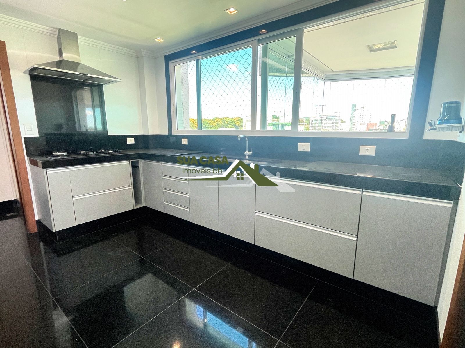 Com bancadas em granito, armários sofisticados, fogão cooktop, forno elétrico e triturador.