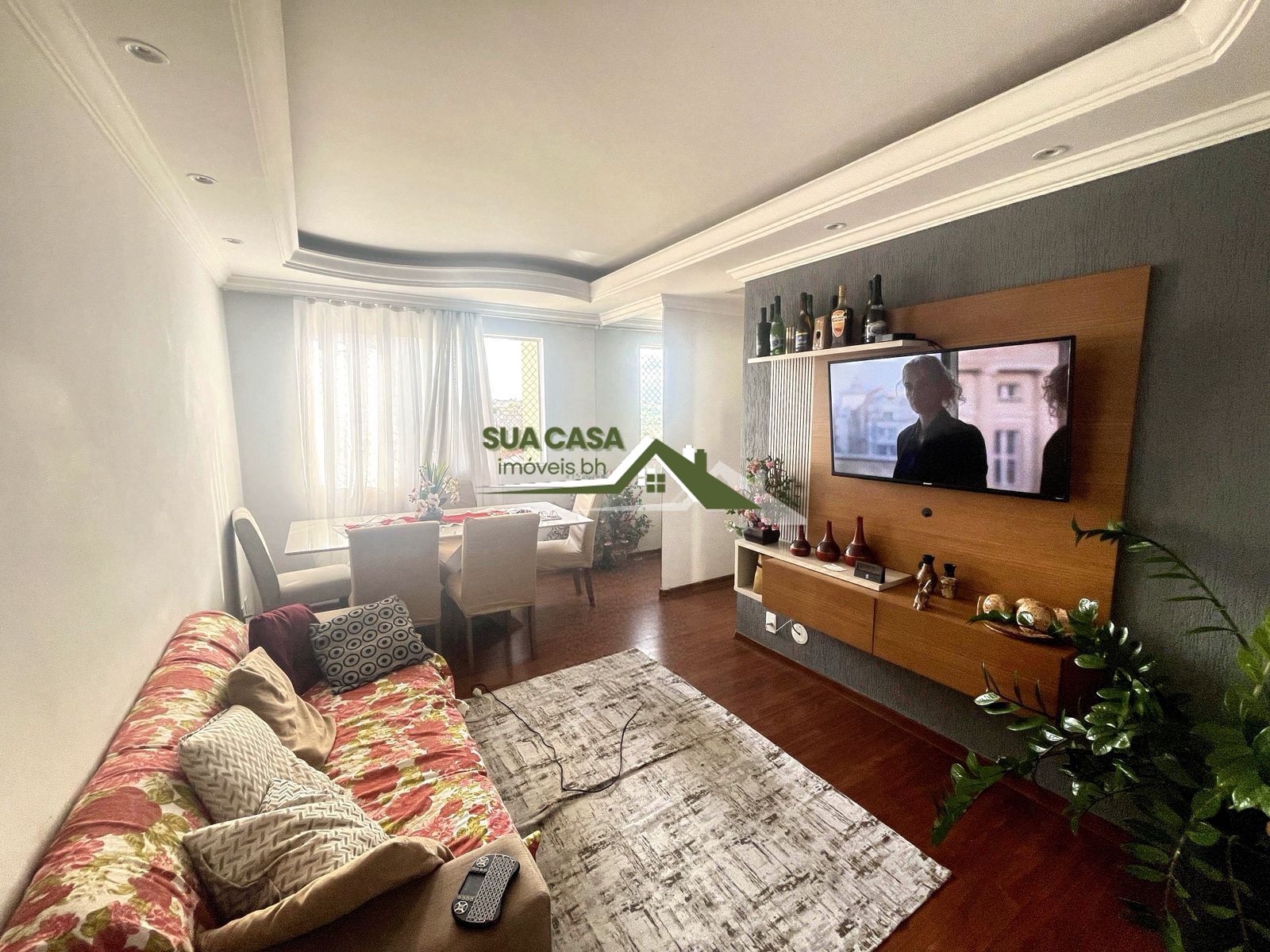 Ambiente integrado, acolhedor, ideal para TV e jantar.